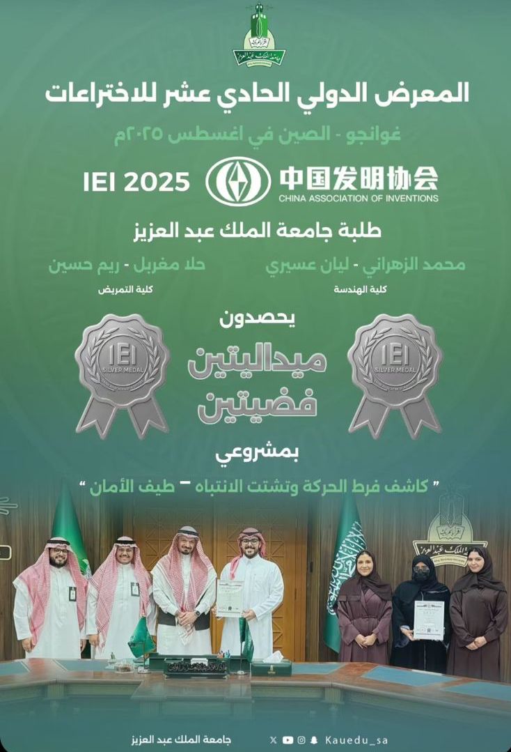 نبارك لطلبة جامعة الملك عبدالعزيز حصولهم على ميدالتين فضيتين في المعرض الدولي الحادي عشر للاختراعات في الصين عن شمروعهم كاشف فرط الحركة وتشتت الانتباه ومشروع طيف الأمان