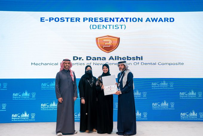 تبارك جامعة الملك عبدالعزيز للدكتورة دانة هاشم الحبشي خريجة كلية طب الأسنان حصولها على المركز الثالث في مسابقة عرض الملصقات الإلكترونية لفئة أطباء الأسنان عن بحثها في سنة الامتياز بإشراف د. همام باهمام والدكتور بسام زيدان ، في المؤتمر الإقليمي للاتحاد العالمي لطب الأسنان (FDI) والمنعقد بالتزامن مع المؤتمر السنوي للجمعية السعودية لطب الأسنان 2025 SIDC وبالتعاون مع المنظمة العالمية لأبحاث طب الأسنان